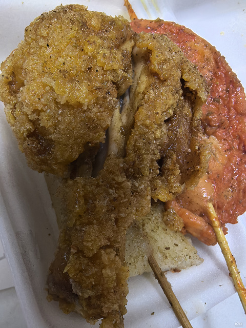 炸鸡腿真香啊,滚了鸡蛋液,炸年糕也好吃 ,还有里脊肉。买了一个玉环文旦,8元一斤 ,花了24元。