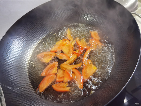 1个番茄,一团面,一个鸭蛋,一勺黑芝麻清水→水煮