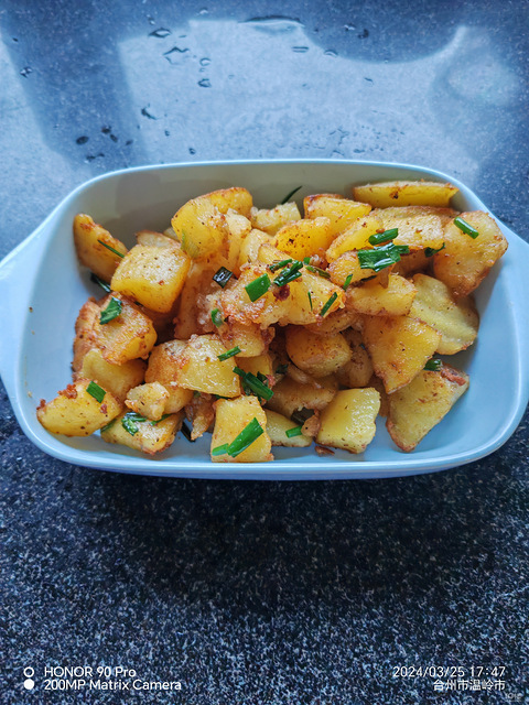 土豆切块,高压锅上汽一分钟关火,倒出来沥干水,热锅热油,下土豆块,炸八面金黄,盛出来,锅里底油,放炸好的土豆块,葱白,麻辣鲜,拌匀放葱花,哇,好香,可以天天吃