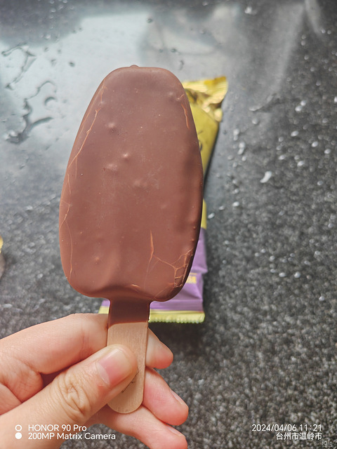 咋换包装了呀?这是新品哦,那要尝尝的,嗯好吃,巧克力外皮,里面香草味冰激凌,好好吃,可以再囤点