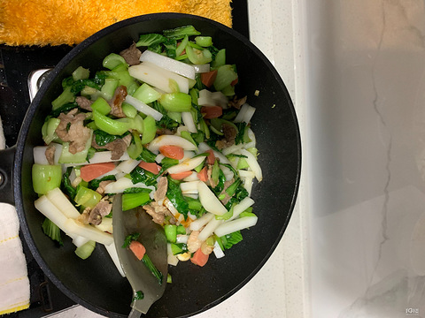 4月16日晚餐,炒年糕。临下班,娃他爸说要吃炒年糕,刚好家里还有婆婆给的一株糕。倒点油摊两个鸡蛋,鸡蛋是我们家吃的最多的食物了,然后爆香蒜,加肉先翻炒,肉比较难熟,接着加入香肠、青菜炒,然后是年糕和鸡蛋,中间加点水,防止粘锅,我炒的年糕是带点汤水的,因为我家小宝贝不是很喜欢吃很硬的年糕。今天又是简单的一餐结束!今天也有在好好的吃饭呀!