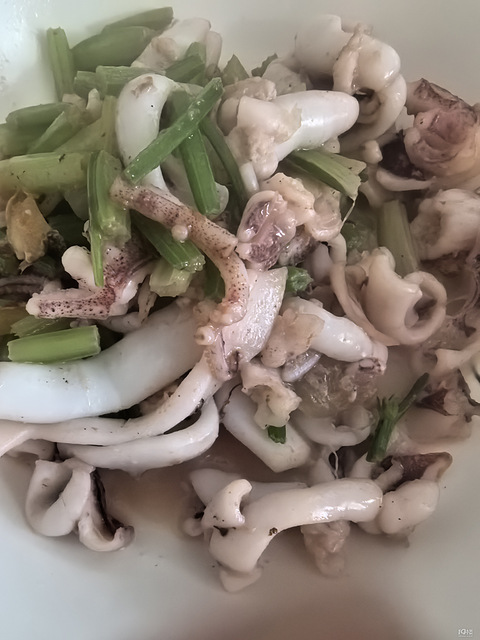 鱿鱼炒芹菜,很鲜好吃。咸鸭蛋是自己用黄泥腌制的,算小成功,味道还不错哦 咸鸭蛋好吃