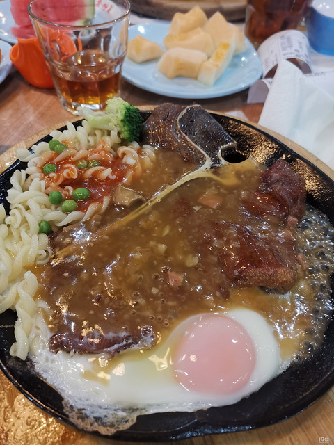 两份牛排,一份小吃,水果小菜自助两杯饮料,非常饱!还有两个大面包,适合一家三口!牛肉一份很大!