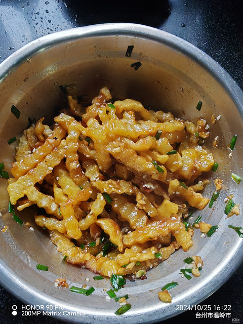 又吃狼牙土豆了,土豆切好泡水里洗掉淀粉,捞出来重新泡水里,然后油炸,这次少,直接一次性炸好,没有复炸,调料浇热油,再加生抽耗油康乐醋辣椒油拌匀,老好吃了