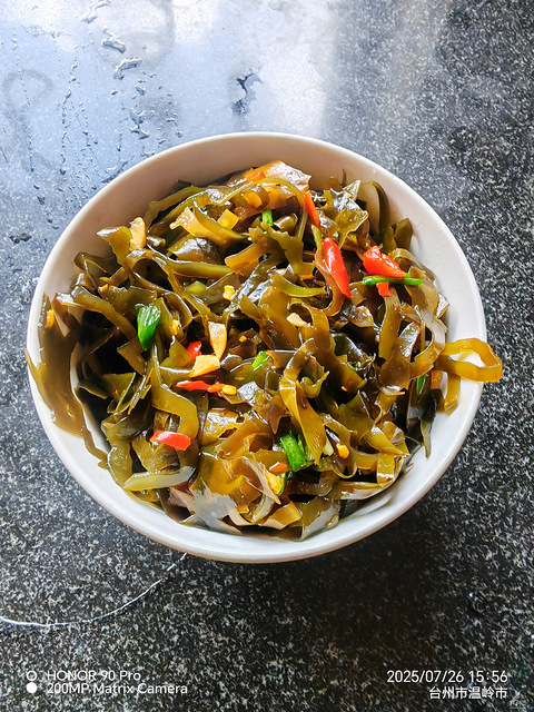 海带丝洗干净,锅里水开加点盐和油,放入海带丝煮,我煮了三分钟,捞出来,喜欢脆口的就过一遍冰凉白开,我没过哈,放生抽老抽耗油白糖盐,醋,蒜蓉剁椒酱,葱花,鸡精,拌匀就可以了。