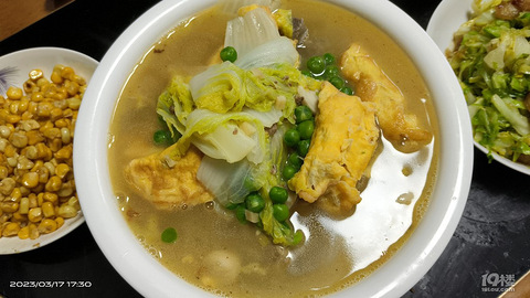 蛋饺菜心青豆汤水煮水果玉米猪心菜