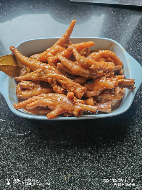 最近吃的基本上都是凉拌鸡爪,来做一下红烧鸡爪换换口味,鸡爪剪指甲洗干净,生姜老酒水开焯水一下,再洗干净,锅里倒油,放八角瓜皮生姜油煎一下,放入鸡爪炒炒,放生抽一点点老抽,耗油,翻炒均匀放一片香叶,加热水煮开放高压锅炖,我喜欢吃软糯的口感,大火上汽后赚了小火20分钟,老好吃了