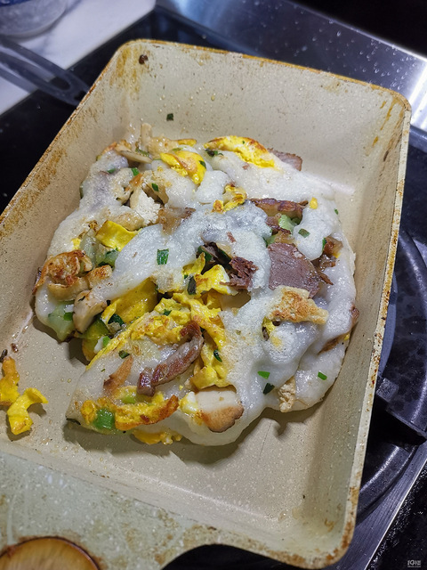 就是类似嵌糕麻糍当糕,包进去菜肉再煎一下微波炉一分钟加热麻糍方便包裹,再把菜肉什么包进去再煎一下,估计只有天台这样吃吧!