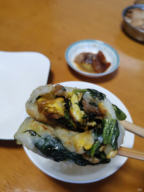 冰箱里的麻糍解冻,炒点猪肉蛋菜夹心煎一下一碗粥,这个季节,白萝卜丰收酱萝卜配粥!