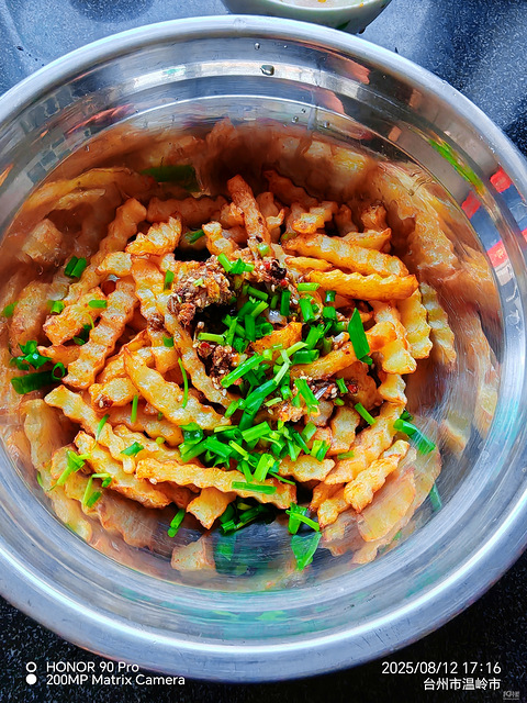 买了两个大土豆,侄女说想吃狼牙土豆,削皮,切条,泡水洗掉淀粉,沥干。锅里油热调个香迷糊的蘸料,放土豆条炸,翻动一下,喜欢脆脆的就炸三分钟,我喜欢吃面的,炸了七八分钟,捞出来拌上热油嗞的调料,再加生抽,香醋,香油,盐,鸡精,葱花拌匀