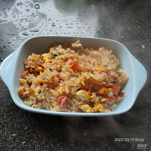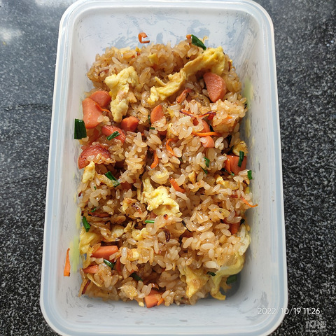 冰箱里的一袋炊饭,放着两天了,拿出来洗洗,因为粘一块了,搓洗散开粒粒分明,然后加鸡蛋火腿肠胡萝卜丁炒炒,嗯,出锅前撒葱花,好吃!