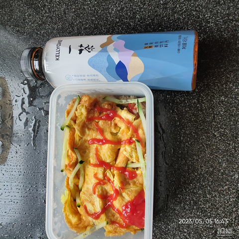 中午剩下一碗米饭,晚餐就蛋炒饭,感觉太单调,再煎个蛋铺上面,番茄酱挤点装饰,黄瓜丝随意撒几条。