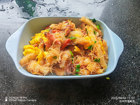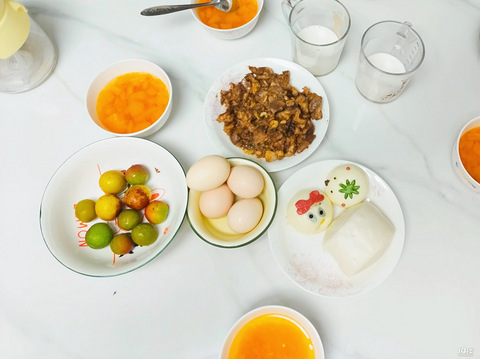 中午超级简单,炒炊饭+白凉粉,糯米饭加鸡蛋,虾皮,火腿肠,胡萝卜丝炒炒,加点葱花,可以了,昨天反馈白凉粉不够甜,今天加了红糖水,纯牛奶和桂花必加,好看又好吃[ej=1F60D]
