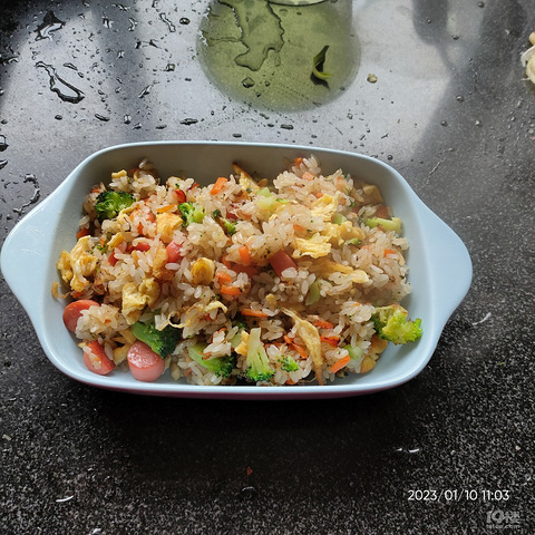 炒炊饭加了点西蓝花,瞬间颜值爆表了,好看哈!鸡蛋皮,虾皮,火腿肠,胡萝卜丁西蓝花炒炊饭,看着就好吃,肯定是好吃!