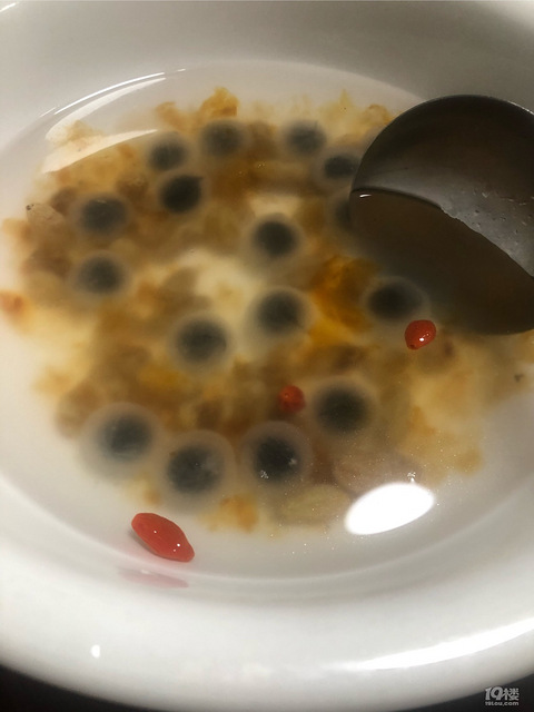 水晶汤圆,里面也是芝麻馅,放点葡萄干,枸杞,还有桃浆一起烧烧,挺好吃的。还有一大碗汤芦荟蛤蟆膏红枣一起烧烧,非常清弥,蛤蟆膏,就是蛤蟆油,说的就是雪蛤吧,这是一碗白里透红的汤,可惜没时间拍照,只记得真得好喝。