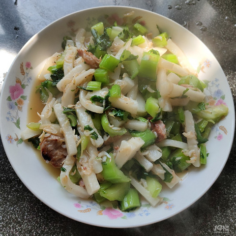 其他配菜先炒一锅蒿菜切碎点,比较香!年糕和菜梗先炒,半熟的时候再放入叶子再加入其他配菜翻炒用花草炒是一样!放了春笋,很鲜美!