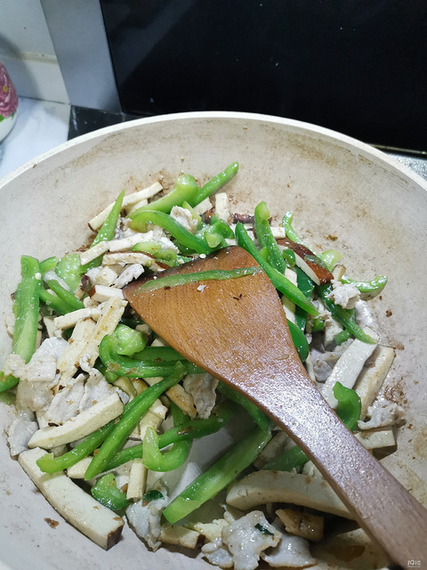 来两道绿色蔬菜外公家摘的青菜,和香菇炒!青椒,豆干,瘦肉做个炒菜吧!瘦肉炒一下盛出来,再炒豆干,再青椒加入盐和酒,放入肉片!