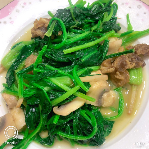 绿油油的菠菜,菠菜炒蘑菇。红烧虾。牛肉,辣鸡腿,香肠,酱肉片和酸菜一起蒸蒸@台州小帮帮06