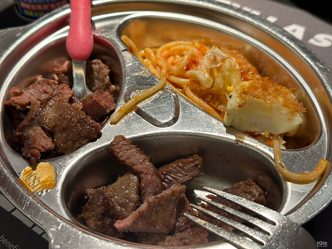 一个人带娃不想烤厚切,点了儿童牛排,有薯条意面,一小块牛排刚好够娃吃,现在喜欢芝士条大于榴莲披萨了
