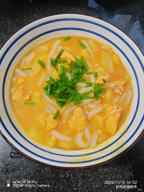 一个土豆切块,一块鸡胸肉切小块,热锅热油放入土豆块和鸡胸肉煸炒变色再煎一下,放咖喱炒炒,加点老酒,加点盐,热水,咕咚咕咚小火炖个15分钟,放土豆粉,煮三分钟就可以了,撒葱花,开炫。