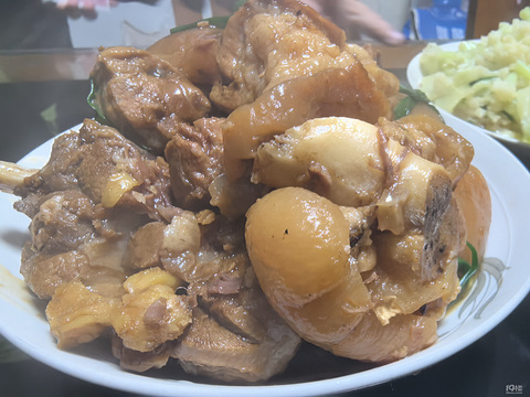 豆面烧老鸭,放了点大蒜叶,感觉很好吃。还有红烧肉烧的也很嫩,汤汁拌饭很不错。