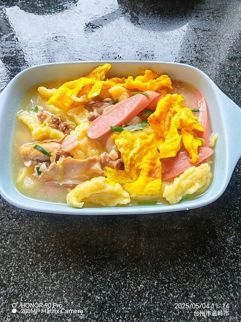 说好久没吃麦虾了,家里面粉是有的,安排,面粉加两个土鸡蛋,一点盐,加水搅和好,大白菜洗干净切好,摊两个鸡蛋,锅里油热放肉沫炒炒,一圈老酒,然后加大白菜炒再加热水,水开再一条一条刮下麦虾条,加盐,味精,生蚝肉,再放火腿肠,葱花,出锅,很鲜甜