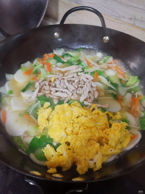 猪肉,鸡蛋,金针菇青菜,胡萝卜,年糕炒一炒,煮一煮三个人午餐搞定!