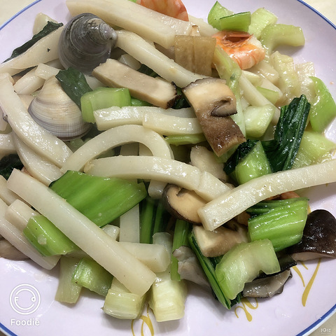 自己做的三鲜炒年糕,味道也不错,蛤蜊20一斤,小虾20一斤,乌冬菜很好吃嫩,放点鲜蘑菇,自己做的vs外面吃的