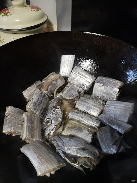 18一斤的带鱼来两只,洗净晾一晾煎一下,方葱姜蒜再放料酒,再来点水煮五分钟,出锅再来个虾干山药木耳晚饭搞定!