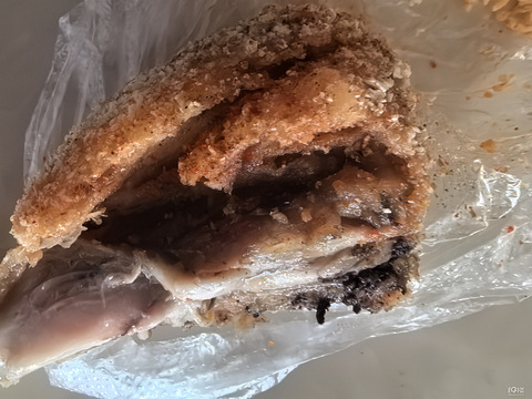 金团,好好吃,里面的馅料也很甜,吃一个中饭都饱了,再来个黄桃罐头。