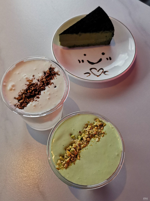 椰子水配蛋糕椰子水不错,纯正的,一款放了海盐芝士,一款开心果好喝的,黑金抹茶蛋糕颜值可以味道中规中矩!两个人这样吃够了!