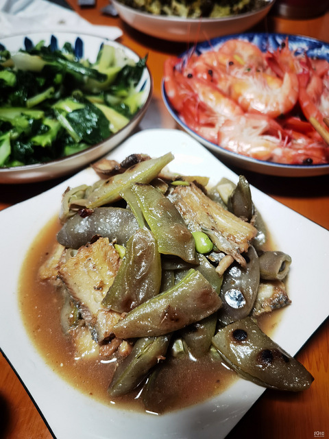 虽然天气冷了,但花坛里的都豆还是再长摘一把,和带鱼煮了,煮得很熟好吃的!再来个水煮对虾,小青菜,现在没打霜,菜都有些老放了猪油都不行!!!