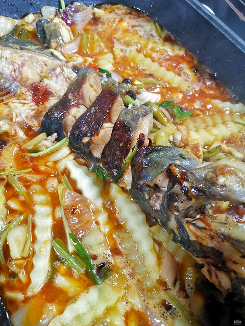 一只江团,一份配菜, 配菜包含年糕,土豆粉,土豆, 金针菇,娃娃菜! 四个胃口一般的人全部吃完, 已经很饱了,烤鱼味道还是可以的, 最爱还是吃完后涮的土豆粉, 顺滑可口!