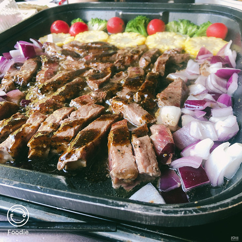 牛排孜然味很香,滋滋响,还有玉米,西兰花,洋葱。吃几块就饱了,会有点腻。