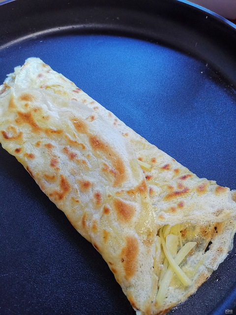 昨天的糊拉汰粉还有早饭土豆丝糊拉汰,放了玉米粉看起来有点黄煎的时候放了肉沫油,煎得酥脆,好吃的