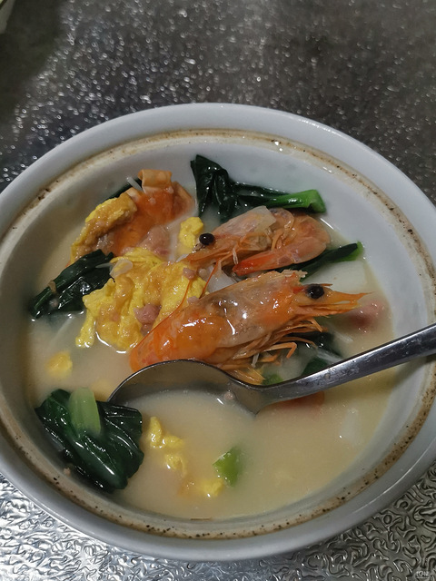 有什么做什么午餐肉,青菜,鸡蛋,金针菇年糕汤再来几个50一斤的虾干大火煮5分钟开吃!