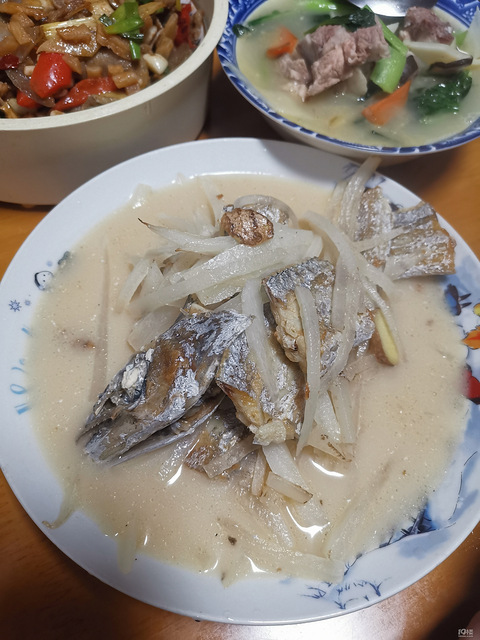秋季白萝卜赛人参弄了一只带鱼一起煮了之前打包的萝卜干炒猪舌蒸在米饭上炖了个排骨煮熟后,放点青菜便捷!!!