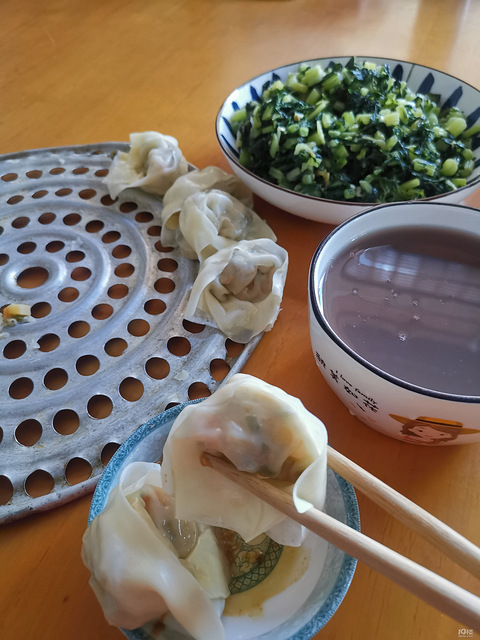 扁食+杂粮粥蒸八分钟,吃五六个昨天打包回来的虾皮随便吃吃吧!
