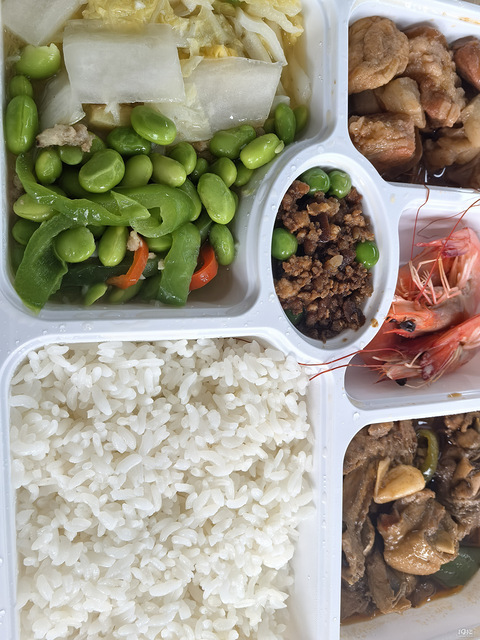 油豆腐挺好吃的,炒茄子,冬瓜海带结汤,吃完快餐吃一个黄桃,真甜!
