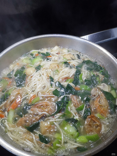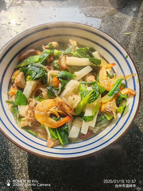 简单煮个面,青菜,虾干油泡,蘑菇,胡萝卜,猪肉荸荠……挂面煮一下再拌点打包回来的外婆菜好吃的!!!