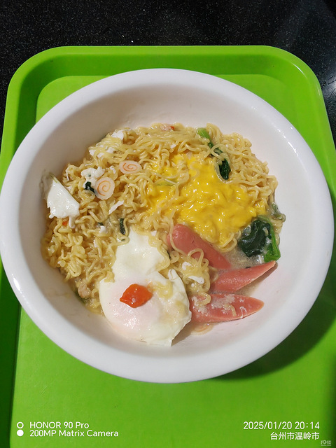 晚上饿了,吃肉肉怕太胖,煮碗方便面吃吃吧,煎个荷包蛋,一根火腿肠,一颗小青菜,海鲜方便面,煮好放一片奶酪片,奶酪片融化就可以了,老香了