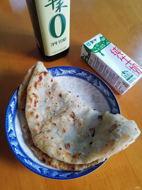 早饭吃了一大个午饭就少吃点了葱肉麦饼配牛奶!
