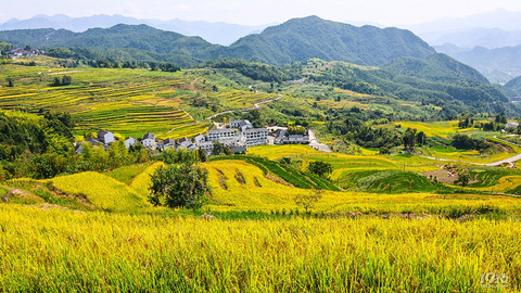 深藏在千亩古韵梯田中的山村,凭借独特的资源,乘着乡村振兴的东风,大力发展旅游产业。秋日里,梯田上的水稻挂满了金灿灿的稻谷,农民们用自己的大丰收,吹响了“共富杨丰山”的号角,喜迎二十大,并为此送上厚礼。 地处仙居朱溪西北面的杨丰山,千亩古韵梯田层层叠叠,磅礴壮观,村庄罗布其中。晨起薄雾笼罩,黄昏炊烟袅袅,成熟的稻谷把秋日的杨丰山染成了金黄色,宛如一块块绸布覆盖在大地上,农民们以独有的方式,在稻田上“