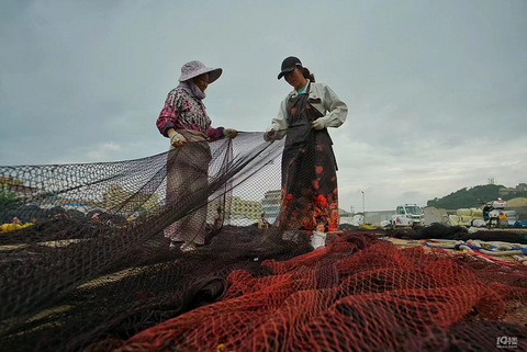 【我身边的共同富裕】摄于浙江温岭松门。俗话说一方水土养一方人,生长在海边的人,有着独特的生产方式和生活规律,她们潮退而作,潮涨而息。浙江温岭市渔民进入伏季休渔期时,渔船进港、人货上岸。可是渔村的渔家女却闲不下来,渔嫂们忙亦乐呼!渔网需要维护修补。在松门礁山码头附近的一露天场地,这里是渔嫂们补渔网的“阵地”。几十名渔家女戴上斗笠,围上破旧的围裙,拿上刀具、梭子和水杯,正紧张忙碌着,飞梳走线地修补渔网