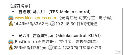 告别吉隆坡,出发马六甲,就是地理书本上的马六甲!太喜欢这个小城了,打车方便,吃饭方便,沟通方便!华人很多,来到马六甲后几乎没讲过英文了 从吉隆坡来马六甲要坐大巴车,怕国庆座位紧张,我在国内就提前买好了,网上有很多坐车买票的攻略,买车票的渠道也很多,选择了不用注册、不用绑卡、可以支付宝付款的渠道,都能自己选座位和选不用运营商的车,不过缺点是退票或者改签比较麻烦。 去程:吉隆坡TBS车站→马六甲车站