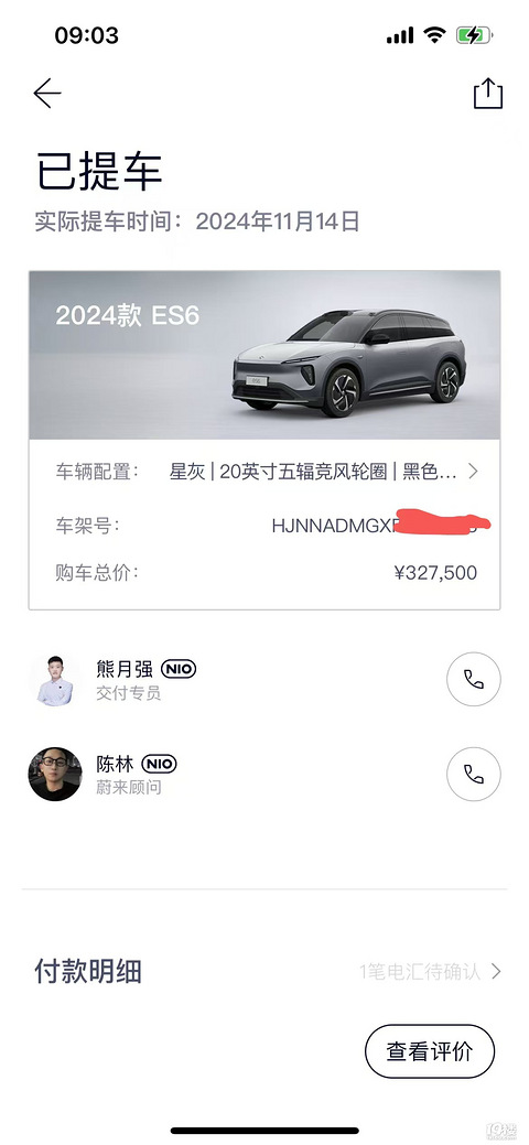 1、车型:蔚来ES62、价格:3275003、家庭人口:4人4、购买时间:2024年11月14日买车过程分享:一次偶然的机会,和同事出差接触到蔚来这个品牌的汽车,感受到汽车内饰的豪华,整车智能化比较高,也感受到蔚来3分钟换电,之后就有点心动,本来预算20W内的,最后车价加保险(9000+)、充电桩(4800)干等到34W了。接触时间应该在2024年10月20号左右,期间手机查看蔚来、极氪、小鹏、理