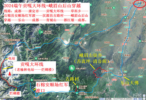 贡嘎山位于四川省康定市,是大雪山的主峰,海拨高度7508.9米。周围有海拔6,000米以上的山峰45座,主峰更耸立于群峰之巅。高出其东侧大渡河6,000米,被喻为"蜀山之王"。 驴友口中的贡嘎大环线,是指从康定市老榆林水电站为起点,翻越海拨4928米的日乌且垭口后,然后下山经过子梅村、巴望海,最后到达终点烂碉房,全程大约80多公里(见下面地图)。 下面说说我们这次10天的端午行程: