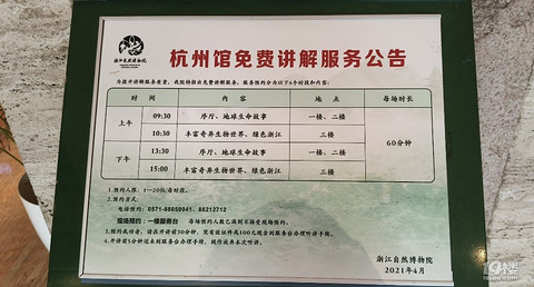 这两个地方就跟台州的科技馆和博物馆一样,离得很近,比较适合带小朋友一起去涨知识。博物馆一定要把握讲解时间,讲解的知识量比较大,有讲解的参观更有价值,讲解要提前到服务台预约,比如下午13点半的讲解,时间充裕的话,差不多一点左右就可以去服务台预约了,记得带上有效证件,因为服务台会给你一个听讲解的无线挂耳设备,需要登记。参观博物馆一定一定安排讲解附讲解时间表交通也很方便,地铁一号线到西湖文化广场,C出口