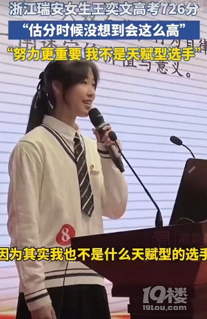 高考成绩比我估分的成绩高出20多分,真的算是意外之喜了。”温州女孩王奕文在今年高考中取得了726分的优异成绩(语文137,数学149,外语143,物理100,化学98,生物99)。 王奕文是温州瑞安人,初中毕业于瑞安市安阳实验中学,高中在浙江省镇海中学就读。记者通过电话联系王奕文时,王奕文一家正在驱车赶往宁波的路上,她打算到学校和老师讨论学校和专业选择。王奕文说:“目前还没决定好要就读的高校,但我