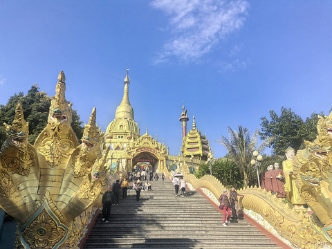 旅游地点:云南(昆明,大理,腾冲,芒市)游玩天数:6天游玩费用:人均5000游玩内容:第一章:缅北不敢去,芒市可以有勐焕大金塔坐落在云南省德宏州州府-芒市东南部孔雀湖畔的雷牙让山顶。青山绿水间的“勐焕大金塔”金光灿灿,光彩夺目,雄伟壮观,更显神圣。是芒市标志性的建筑,也是生活在这里的傣族人民的圣地。芒市不忙,感觉在这里生活的人们很悠闲,虽然是边境小城,但这里的治安也还可以,过边境也没想象中的那么紧
